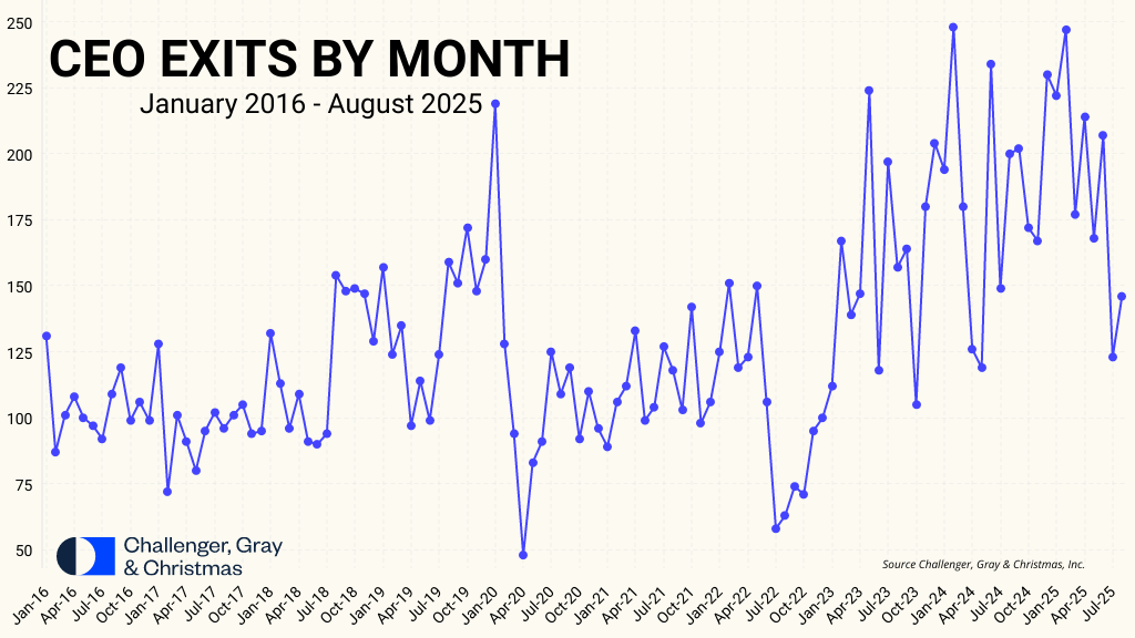 Entertainment/Leisure has also seen significant activity, with 123 CEO exits through August 2025, up 22% from 101 during the same period last year.