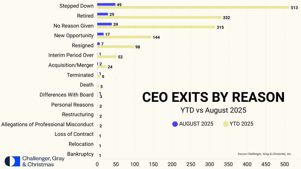 The most common reason cited for CEO departures in August was leaders stepping down from their roles, with 49 exits last month and 513 so far in 2025. This category, which often reflects orderly transitions or executives shifting into advisory roles, continues to be the top driver of CEO turnover this year.