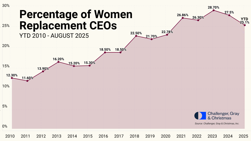 Through August, 1,504 CEOs have left their posts, the highest on record, since Challenger began tracking in 2002. It is up 4% from the 1,450 CEO exits in the first eight months of 2024.